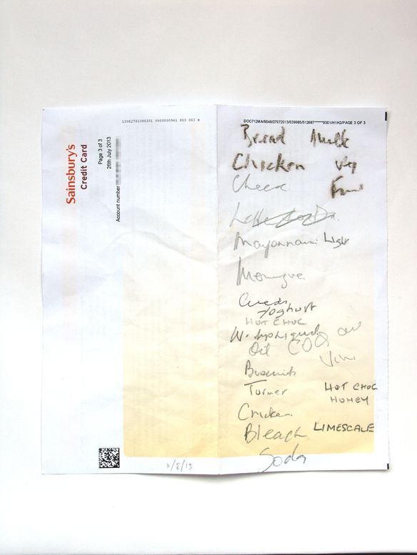 Abbreviation, black ink, Collaborative, Milk or bread or eggs, Pencil Bread, Chicken, Cheese… Posted by rjwnewton on August 28, 2013 A collaborative effort and use of credit card statement (Sainsbury’s). Found Waitrose Winchester 11/08/13. Share this: Click to share on X (Opens in new window) X Click to share on Facebook (Opens in new window) Facebook Like Loading... Related